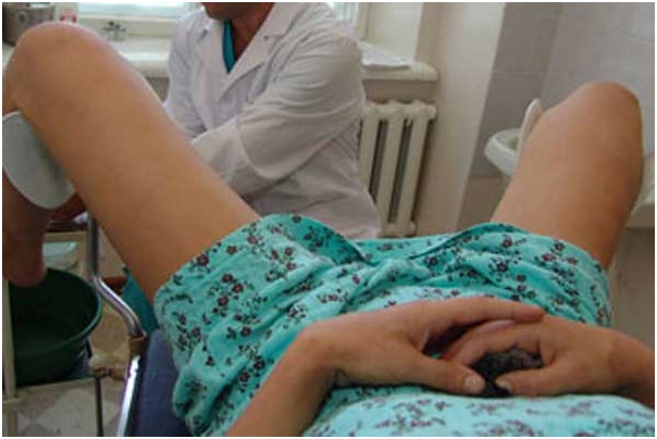 Женщина располагается в гинекологическом кресле, после чего половые органы обрабатываются антисептическим раствором.