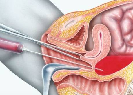 Во время прокола надо следить, чтобы игла направлялась по средней линии или слегка вверх, что бы не травмировать прямую кишку. Осторожным движением поршня отсасывают аспират, это происходит параллельно постепенному извлечению иглы. Полученный образец относят на лабораторное исследование.